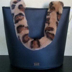 -it can be held by the hand using a fuzzy cheetah print polyester handle or as a crossbody with an adjustable and detachable strap