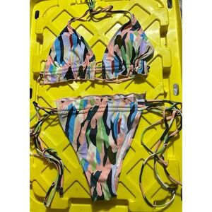 NEW‎ Colorful Abstract Ruffle Trim String Bikini, Size Large