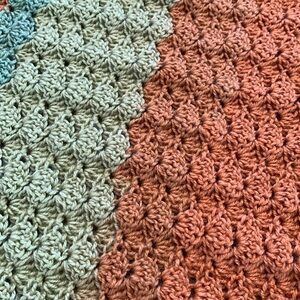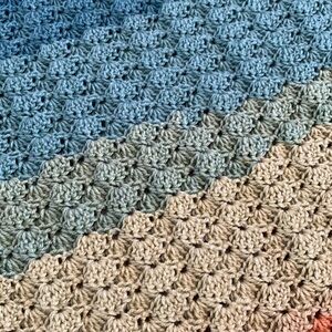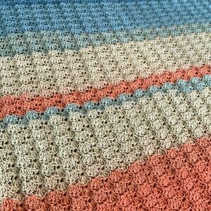 Vibrant crochet blanket with stripes of blue, green, and orange. Perfect baby shower gift.