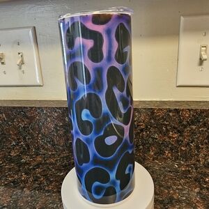 Vibrant tumbler with a unique leopard print design. Features a blend of blue, purple, and black colors.