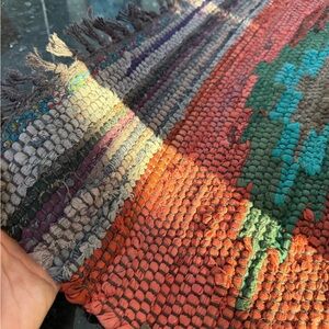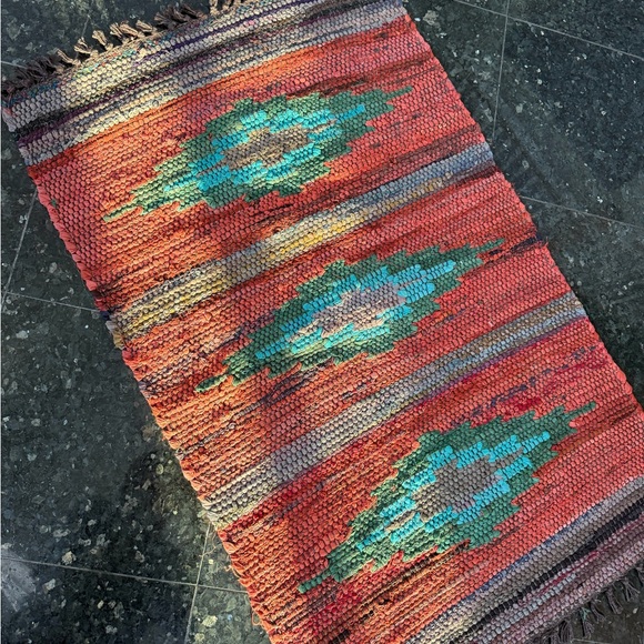 Vibrant woven rug featuring geometric patterns. Rich red, teal, and brown hues.