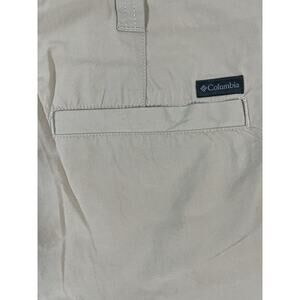 The product is a pair of size 38 Columbia men's shorts in a modern classic style, made from lightweight performance fabric suitable for various occasions such as travel, casual outings, and workwear. The shorts feature a zip closure, mid-rise fit, and a 10-inch inseam, with slash pockets for added convenience. The khaki color and solid pattern make them versatile for all seasons, while the breathable fabric and quick-dry features ensure comfort and practicality. Perfect for outdoor activities or casual wear, these shorts by Columbia combine style and functionality for the modern man.
