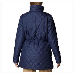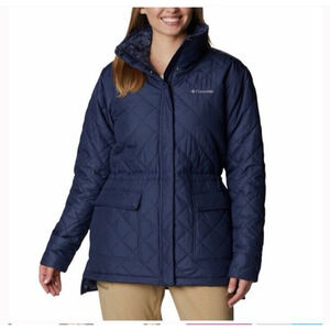 NEW with tags Columbia Navy blue Puffer, Quilted Jacket, Parka. Cozy Fleece lined. Full zip with snap placket. Two front pockets. Adjustable waist on inside makes for a flattering fit. Lower hemline in back for extra coverage. Perfect after the gym!! Rain resistant.