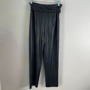 Sleek black faux leather pants with a paperbag waist design and tie belt, offering a contemporary and edgy aesthetic for modern wardrobes.