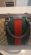Features: Beige GG canvas textile exterior; red and green web stripe; dark brown leather trim and double rolled handles; detachable and adjustable leather shoulder strap; pale gold tone hardware; top zip closure to main compartment; beige textile lined interior with 1 x zipped pocket and 2 x slip pockets.