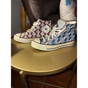 The NEW Converse A04843C Chuck Taylor 70 Twisted Classic Shoes in Women's size 8 are a colorful and unique twist on the classic Converse design. Featuring a high-top style with a lace-up closure, these shoes are perfect for casual and activewear occasions. Made with durable canvas upper material and a rubber outsole, these sneakers are both stylish and comfortable for all-day wear. The multicolor argyle/diamond pattern adds a fun and vibrant touch to any outfit, making them a versatile addition to any wardrobe.
