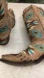 Stylish Corral boots with light distressed look and exquisite turquoise and tan embroidery, with metallic accents. These are gorgeous boots in the original box and with the original packaging.
