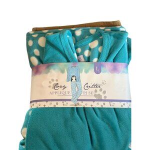 Stay warm and stylish with this Cozy Critter women’s pajama set featuring a plush “Let It Snow” penguin applique top and matching blue polka dot pants. Soft, cozy, and perfect for winter lounging or sleepwear.