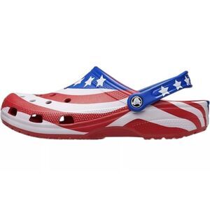 Show off your patriotism with these Crocs Classic American Flag Clogs, perfect for any American proudly watching the game. Slip-on design with ankle strap for a secure fit and limited edition design make these clogs a must-have for any Crocs collector. The lightweight and breathable synthetic upper material ensures comfort, while the red, white, and blue color scheme and American flag theme add a touch of classic style. These clogs are perfect for any occasion, whether it's a day at the beach or a casual outing with friends. Get your pair today and show off your American pride! Brand new in bag!