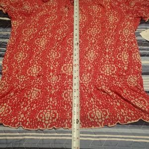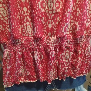 This lightweight flowy blouse has ruched neckline, hem and sleeves with a tie in front