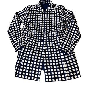 Navy and white checkered coat, women’s patterned long jacket, button front overcoat, grid print outerwear, size small fashion coat, bold geometric print coat, collared statement jacket, chic lightweight outerwear, tailored check pattern coat, stylish modern trench-style jacket