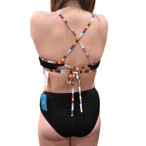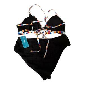 • Meet our Waffle Knit Bikini Bralette & Bottoms Set! The V-neckline and adjustable cross-back straps offer a chic, comfortable fit, while the multi-color contrast trim adds a playful touch to your seaside style.