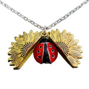 A pretty gold tone sunflower locket opens up to reveal a red and black enamel ladybug! So cute! This necklace is the perfect gift for a gardener or nature lover in your life! It's on an 18" silver tone chain with silver tone jump ring and lobster closure. Trendy mixed metals. The sunflower is about 1 1/8" wide when closed. NEW!