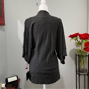 New with tags Stunning 100% Cashmere Timeless Classic Longline Open Kimono Style Draped Cardigan Sweater with Dramatic 3/4 Length Bat Wing Sleeves in Dark Heather Charcoal Gray by Cynthia Rowley. Finely Ribbed Front Placket and Sleeve Cuffs. Open V Neck. Oversized. Shown with Belt For Display Purposes; Belt Is Not Included. Women’s Size XS.