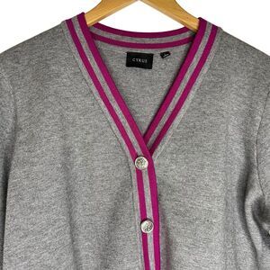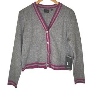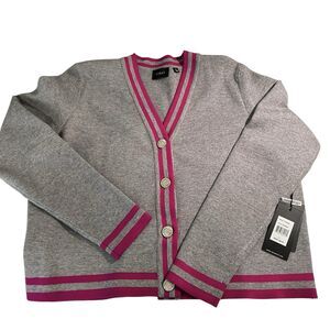 NEW Cyrus NY Crop Cardigan Sweater Soft V-Neck Gray Magenta Stripes LARGE