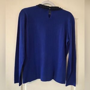 NWT brand new! Gorgeous rich blue viscose/nylon blend top with black jeweled neckline by Cyrus. Elegant. Statement piece. Extra stones included. Button closure at neckline. Measurements in photos. Women’s size Large. Smoke free home