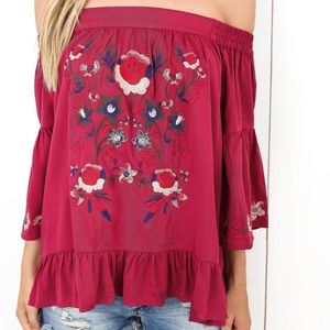 Set for a Villa in the South Of France with spring resort vibes of this top! This boho gem is merlot with half sleeves and floral embroidery on the sleeves and center. Stay comfortable in this off the shoulder silhouette that's flowy in wear! Super soft - super perfect color ready for anything you are!