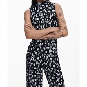 Step into style with the Dotty Mock Neck Jumpsuit by Desigual, a black statement piece designed for the confident woman. This sleeveless jumpsuit features a chic Perkins neckline and a long, relaxed fit with straight legs. It's crafted from 98% Recycled Polyester and 2% Elastane for a comfortable wear, complete with defined seams and a reinforced waist. Closure: Zip closure. Care: Machine wash and tumble dry. Model wears size M (178 cm height, 60 cm waist, 86 cm hip).