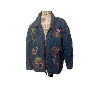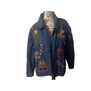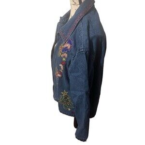 Get ready to rock the holiday season with this limited edition New Directions blue denim jacket! Made from 100% cotton and featuring an embroidered Christmas theme, this jacket is perfect for both travel and casual occasions. The collared neckline and long sleeves with casual sleeve type add a touch of sophistication to the overall look.