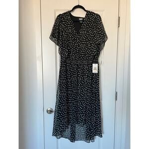 NEW DKNY Chiffon Midi Dress Hi-Low Flutter sleeve Black Polka dot
