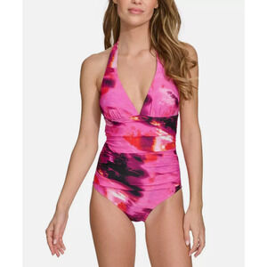 NEW DKNY Pink and Black One Piece Swimsuit Size Small Halter Tie Plunge NWT