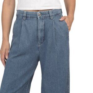 waist rise: 14in, pleated accents, belt loops, contrast stitching, denim design