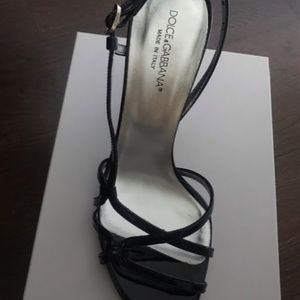 DOLCE & GABBANA BLACK PATENTED LEATHER HIGH HEEL SANDAL. BRAND NEW. NEVER WORN. MADE IN ITALY.