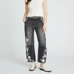 A modern barrel-leg silhouette meets timeless romance. Cut in a soft washed black denim, this Barbara Barrel is adorned with delicate cream and off-white rosette embroidery along the hem and waist, with relaxed slit pockets for that effortlessly cool finish. The contrast of moody denim and light floral stitching makes it the perfect pair to elevate both casual days and dressier night