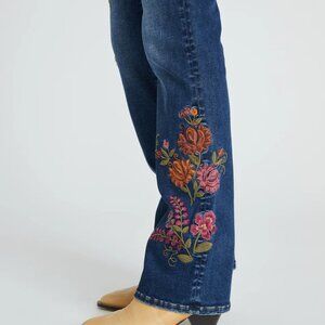 The Kelly Boot Cut in Oshibana brings a touch of artistry to classic denim. Cut in a flattering mid-rise with a timeless boot cut leg, this pair elongates the silhouette while staying effortless and easy to wear. The embroidery trails along the hip and down the side of the leg, creating a soft, organic flow of blooms against the rich dark wash. Thoughtful detailing gives these jeans a unique, hand-touched feel — wearable art that elevates your everyday denim.