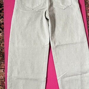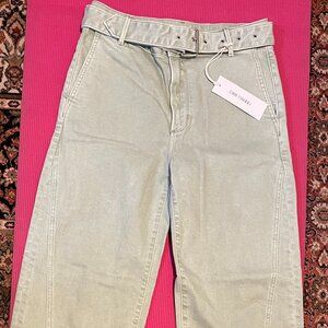 NEW Driftwood Spencer barrel-leg pants, never worn, with removable belt, two slant pockets in front, two back pockets, zip and button closure, dusty-green denim fabric, 99% cotton, 1% spandex, length from waist to hem approx. 39", instep length approx. 28.5".