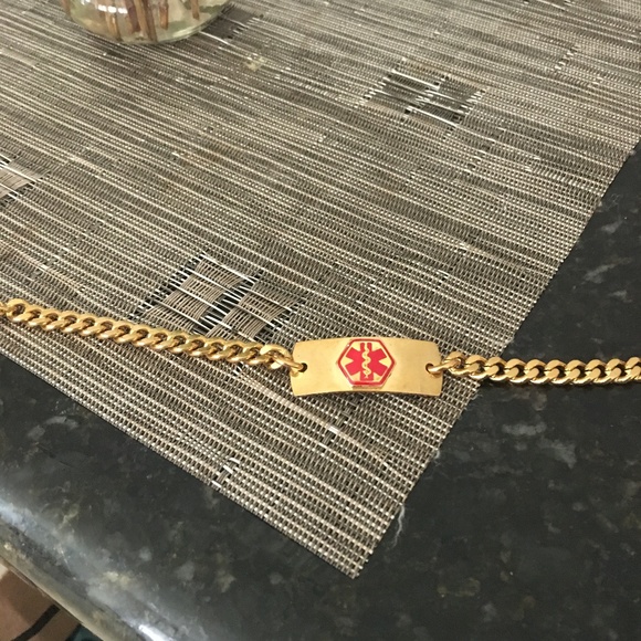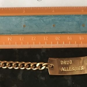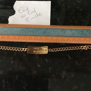 NEW medical alert bracelet measuring 8 inches and adjustable says drug allergies never worn no scratches it is in perfect condition for those who need to let know that they have drug allergies can save your life never worn in great condition