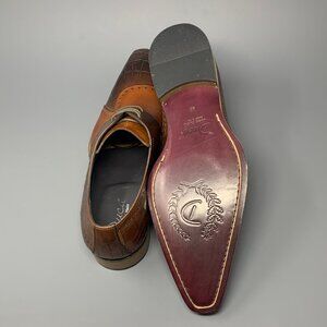 See the fortress expressed in the sleek and streamlined design of the “side” cap-toe. Brogue punch hole and top stitch detailing accents the cap-toe and topline for a beautiful end-note. And, a more exaggerated, chiselled toe makes this a versatile choice for any occasion. Two tone brown/tan dress shoes are hand crafted crocodile embossed print on rich Italian calfskin. Built with Blake construction, these shoes offer flexibility and durability for long-lasting comfort.
