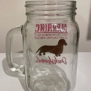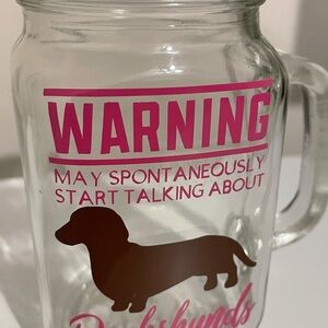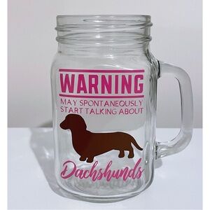 Features: clear glass mason jar coffee mug, warning may spontaneously start talking about dachshunds print, pink and brown, perfect for a dog mom.