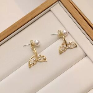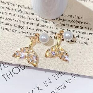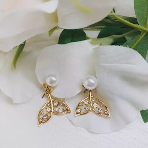 These earrings feature sterling silver posts and golden details. These can be worn as shown like cuff earrings or just as a pair of pearl studs. The mermaid tail attaches in the back and is adorned with crystals.