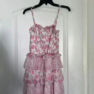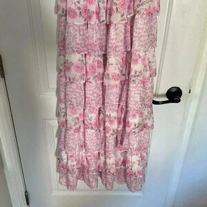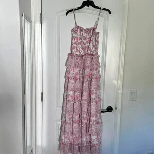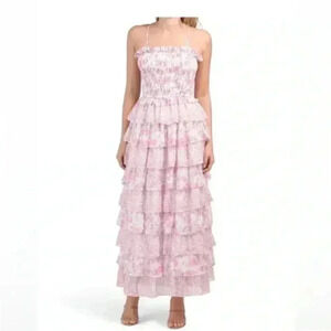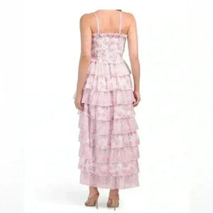 NEW Dalia MacPhee Smocked Bodice Ruffel Tiered Floral Pink Dress Size S