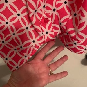 Blouse is a bright pink with black and white accents. Made of 97% polyester and 3% spandex. A size L, it measures 18” pit to pit and 28” in length. New condition with no rips tears or stains. Smoke free but pet friendly home.