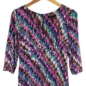 Chic sheath in a purple and multi color stretch rayon jersey.