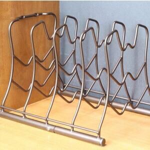 New in packaging Deco Brothers Pan and Lid Organizer Tiered Shelf in Bronze Metal Efficiently Stores Up to 5 Pans or Lids, Saving Valuable Cabinet and Countertop Space. This Free-Standing Organizer Offers Both Vertical and Horizontal Installation Options, Allowing You to Choose the Setup That Best Fits Your Space. For Added Stability, the Organizer Can be Secured to a Fixed Position by Inserting the Included Screw.