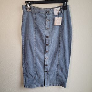 New with tags condition. Nice light wash. Great for festivals or western wear, summer. Skirt has stretch. See pics for approx measurements and details.