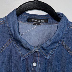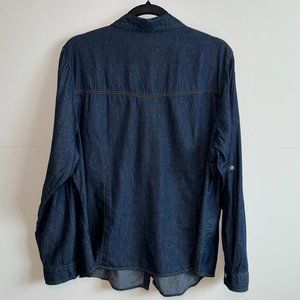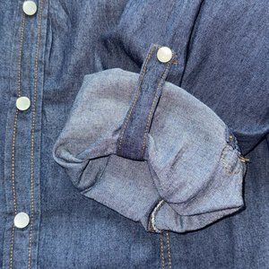 Brand new with Boutique tags, pearly white snap button down shirt top. Dark Indigo blue. Roll tab sleeves. Front flap pockets. A So Sweetly Boutique exclusive style.