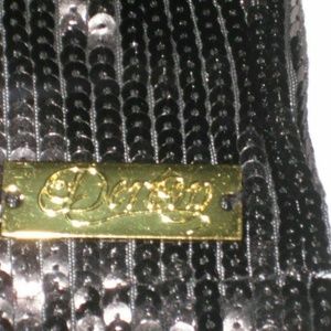 Short sleeve dress is adorned by ruched shoulder detail and a scoop neckline. Front of bodice is covered in sparkling sequins to make you really shine. the back does not carry sequins Metal engraved logo hardware rests at bottom left hem.
