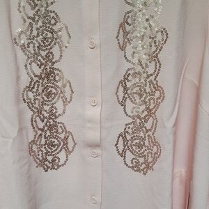 Gorgeous soft pink blouse, never worn, took out of packaging, shown, only to take pics. 3/4 sleeve with notch, 3/4 button down with beautiful sequin design, comes with extra sequins. Has pockets. size xl.