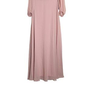 Keywords: chiffon maxi dress, strapless dress, puff sleeve dress, bow belt detail, wedding guest dress, formal maxi dress, light pink dress, bridesmaid dress, elegant evening wear, full-length gown, professional attire, blouson overlay dress, Dessy Collection dress, mother of the bride, mother of the groom