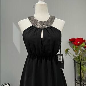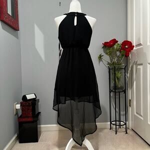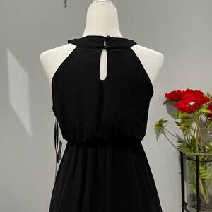 New with tags Gorgeous Draped Chiffon Grecian Goddess High Low Tiered Date Night Boho Dress by Dex Featuring a Sparkly Silver Beaded Halter and Keyhole Neckline. Elasticized at Waist. Sleeveless. Lined. Lightweight. Black. Women’s Size XS.