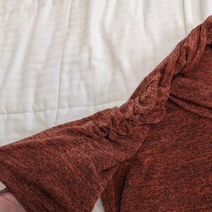 new directions short-sleeved sweater type top with a lot of fun details and embellishment size petite large PL. there is a fun raised embellishment on the left shoulder. the sleeves have a gathered part to add some height. it has a cowl neck. the color is a fun light orange and dark gray sweater pattern. there are two belt loops but no belt however it would look really cute with a little black belt.
