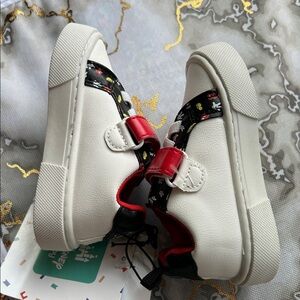Adorable kids shoes featuring a playful design. These shoes come in a stylish white and red color combination, perfect for any little Disney fan.