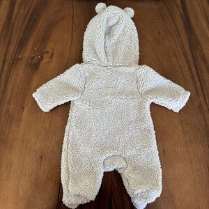 Keep your little one snug in this cozy tan sherpa footed one piece. NEW, never worn only washed, size NB.