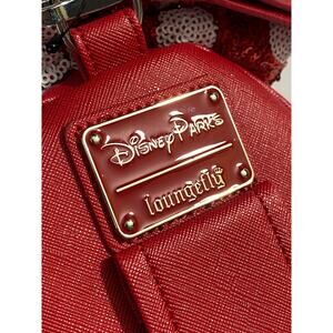 Disney x Loungefly mini handbag featuring classic Minnie Mouse styling with red and white polka dots and a bow detail. Gold-tone logo plaque on front. Zip closure with top handle. Compact and collectible. Pre-owned, clean condition. Great for Disney fans, Loungefly collectors, or themed outfit drops.