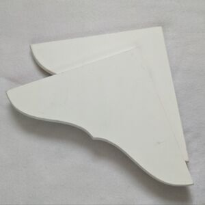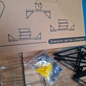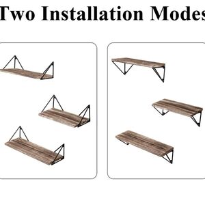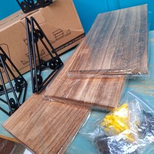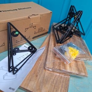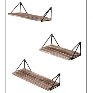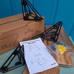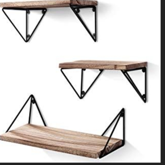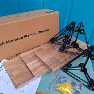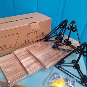 NEW Display Shelves Floating Set of 3 Wall Mounted with Metal Brackets Natural Wood Color Natural Tan Bayka Diamond Corner Holders can be used upside down so shelves sit on top or hang within. NEW WITH TAG ORIGINAL BOX. The shelves and metal are both more lightweight than they look