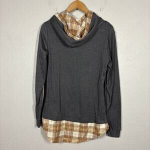 ACcent Hoodie Plaid Trim Pullover Blouse Combo Gray Tan Gold Casual - 35